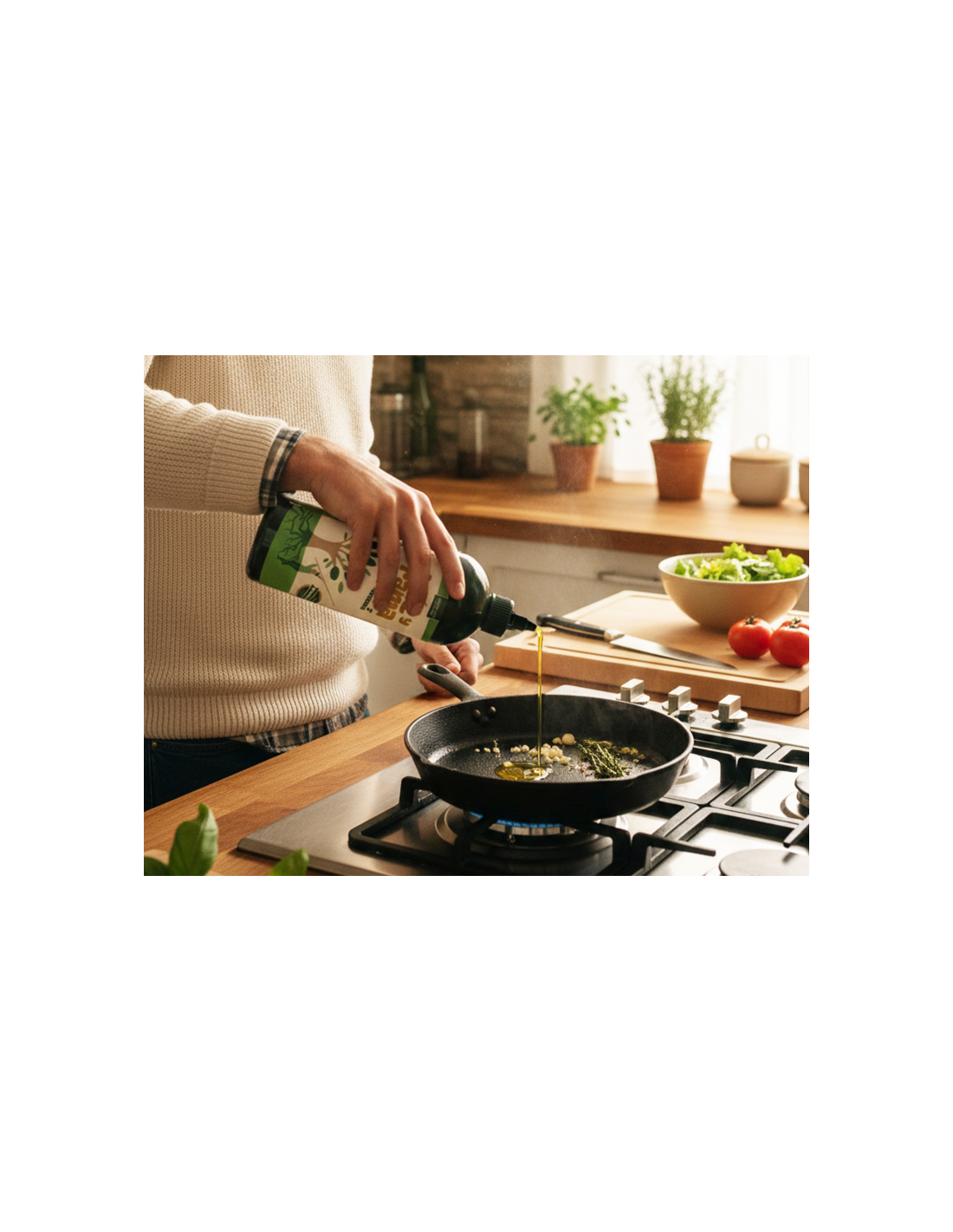 Extraído en frío para que conserve todo su sabor y sus propiedades. Equilibrado, estable y con carácter: aguanta el calor de la sartén sin perder lo bueno.